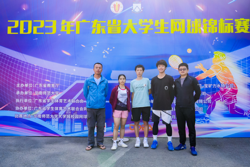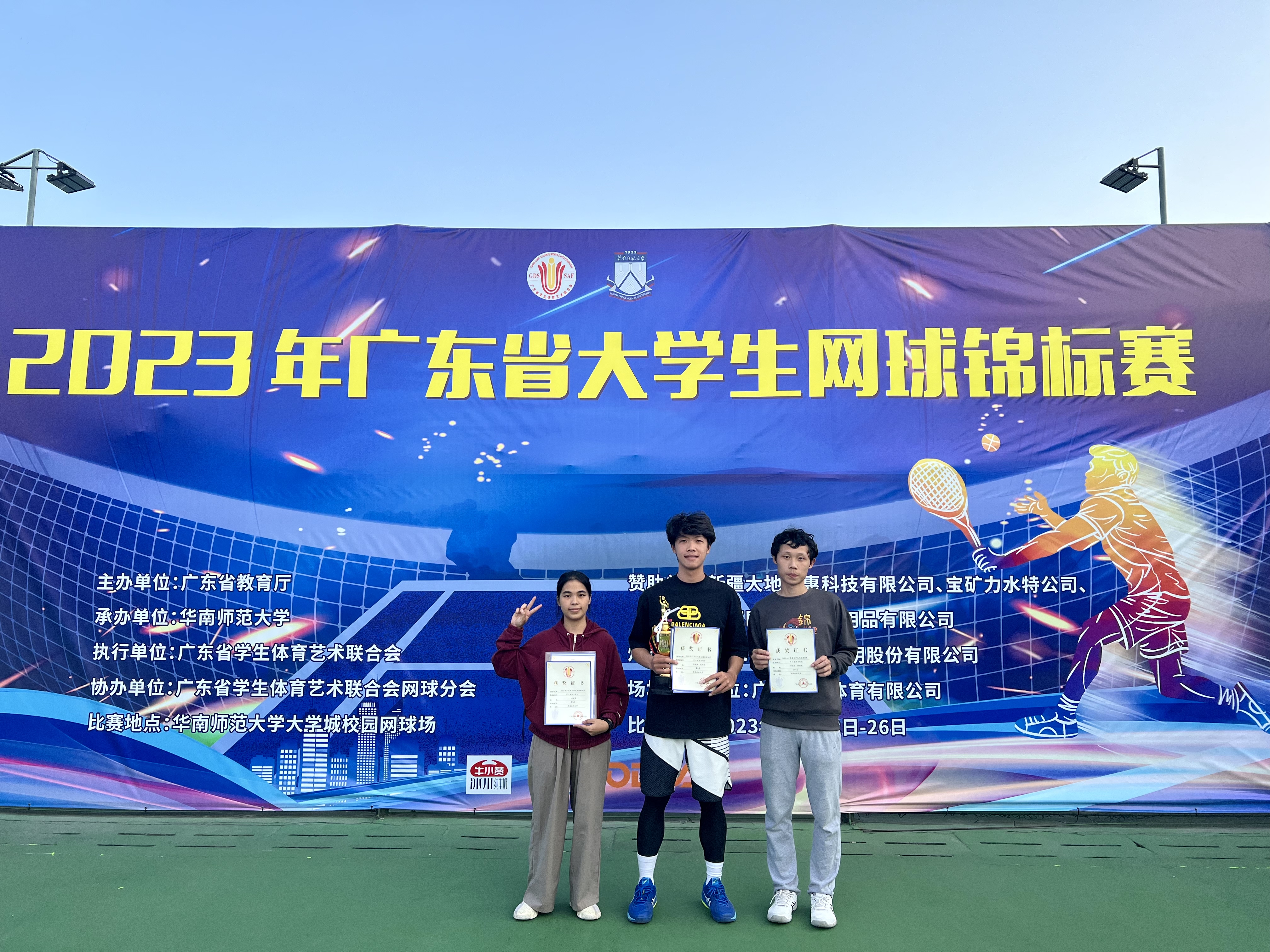 2023年11月22日至26日,2023年广东省大学生网球锦标赛在华南师范大学举行。在学校的大力支持下,我校5名运动员在蔡汇民领队,罗书杰、王一教练的带领下,参加本次比赛。经过四天的鏖战,最终斩获得了男子双打冠军,女子单打第八名的优异成绩,实现了我校网球队冠军零的突破。
