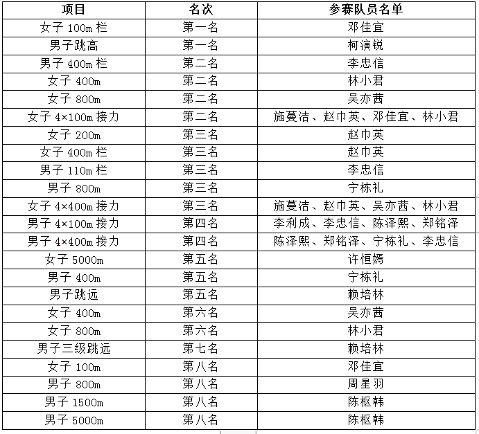 经过3天的激烈角逐,我校代表队以133分的总成绩获得了甲A组团体总分第三名的好成绩!共获得2枚金牌,4枚银牌,5枚铜牌,2项第四名,3项第五名,2项第六名,1项第七名,4项第八名,展现了华南农业大学田径队的骄人风采。继全国农林比赛后,华南农业大学田径队一直积极备赛,与朝阳同升,伴落日不休,落实训练计划,敢闯敢拼,奋力超越自我,终于在赛场上创下一个个“个人新纪录”,也为学校夺得荣誉,获奖情况如下: