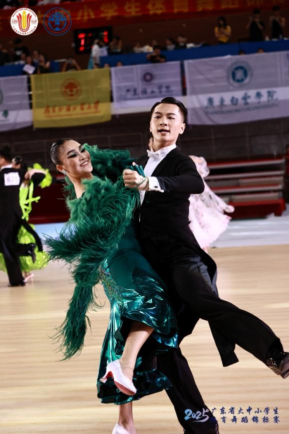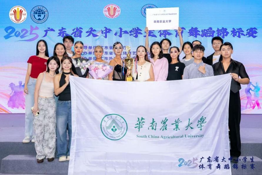 在领队吕立主任、教练员周文英老师、何灵捷老师的带领下,我校体育舞蹈队在2025年广东省大学生体育舞蹈锦标赛中取得了8金6银5铜、4-8名7项及甲组团体总分第一名的优异成绩。我校派出的16名参赛运动员,皆入围前八,去年,我校体育舞蹈队斩获我校最好成绩的亮眼表现,在赛场上留下了属于我们的‘高光起点’;今年,这支队伍带着同样的热爱与更强的实力再度出征,不仅稳住了往届的领先优势,更以细节的优化、配合的升华,再次突破自我!